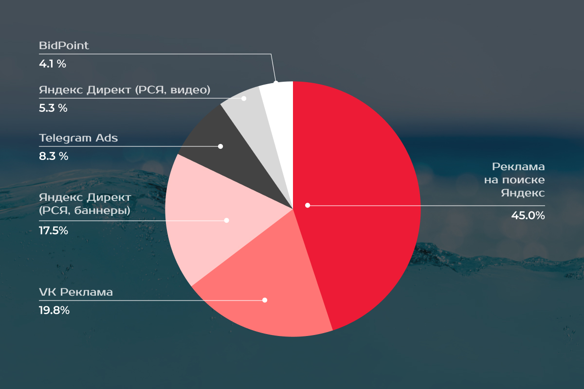 Сплит рекламной кампании сформировался из источников, которые уже хорошо себя зарекомендовали: Поисковая реклама в Яндекс Директ и РСЯ (баннеры и видео). Дополнительно в качестве теста запустили: «VK Рекламу», Telegram Ads, программатик-платформу BidPoint.