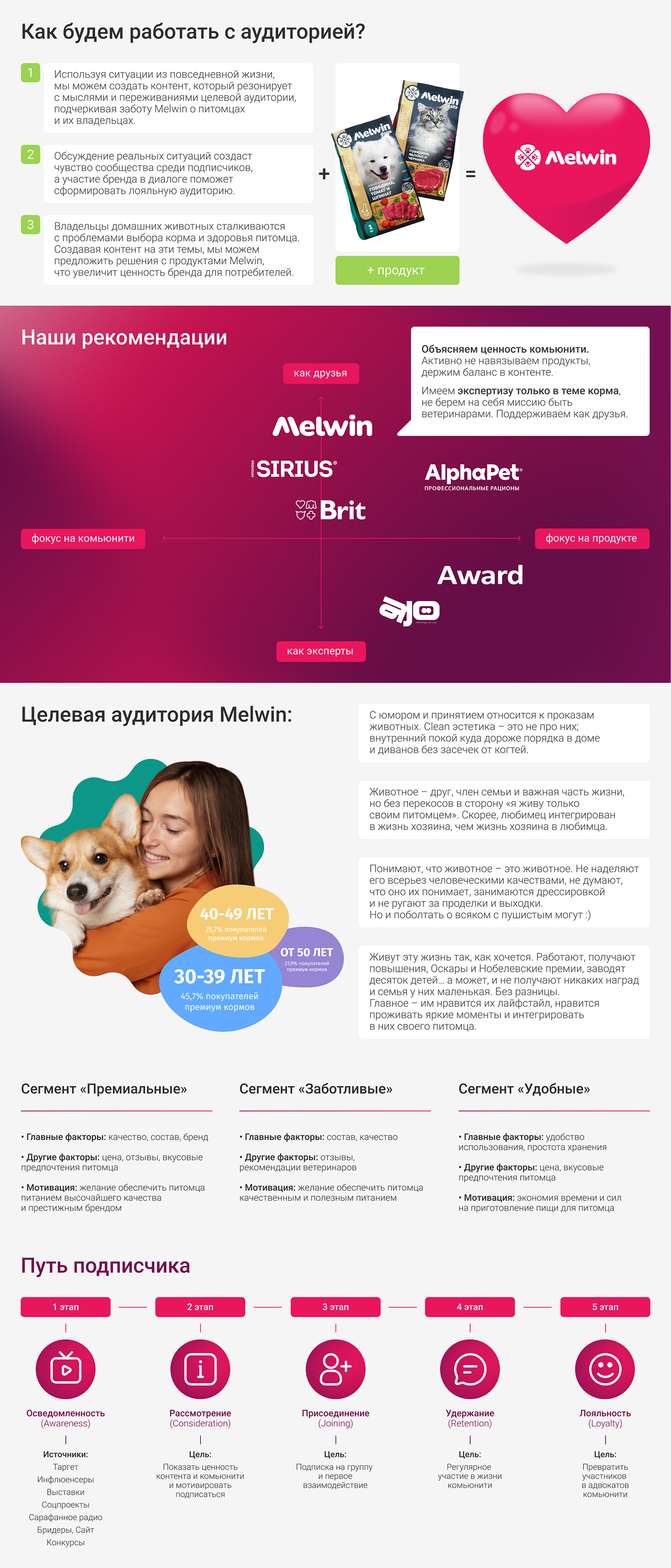 Начали с главного — целевой аудитории. Обновили аватары ЦА и построили путь пользователя от первого касания до лояльности. Аудитория Melwin — владельцы кошек и собак 30–49 лет, которые видят в питомце члена семьи. Это помогло настроить контент под их интересы.