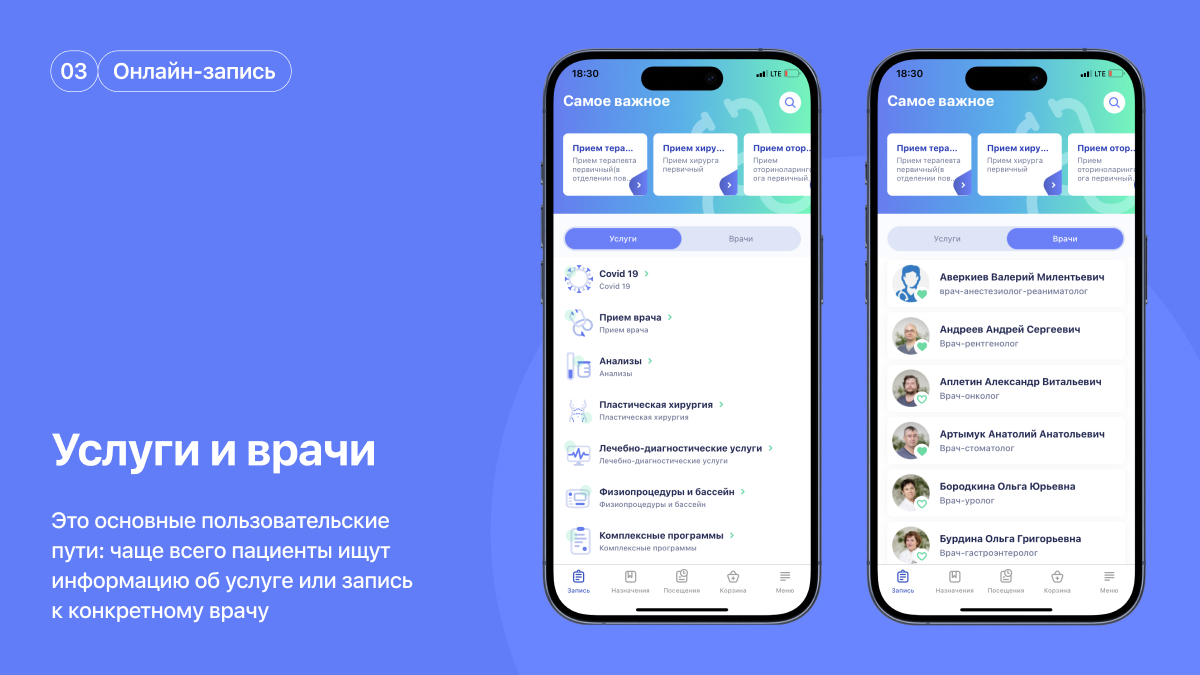 На главном экране приложения выводится запись на платные услуги и прием. Мы сделали две вкладки: «Услуги» и «Врачи». Это основные пользовательские пути: чаще всего пациенты ищут информацию об услуге или запись к конкретному врачу.