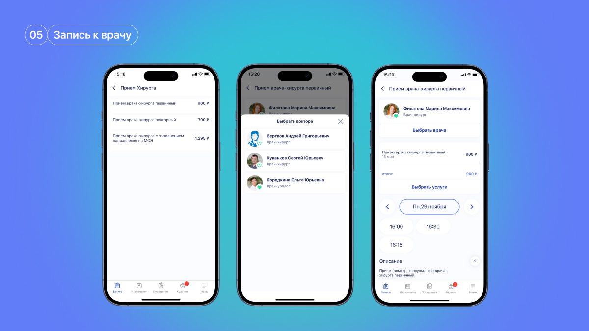 Представим, что пациенту нужно попасть на прием к хирургу. Для этого нужно перейти в раздел услуг с записью к врачам, где приложение предложит выбрать нужную специальность и тип приема.