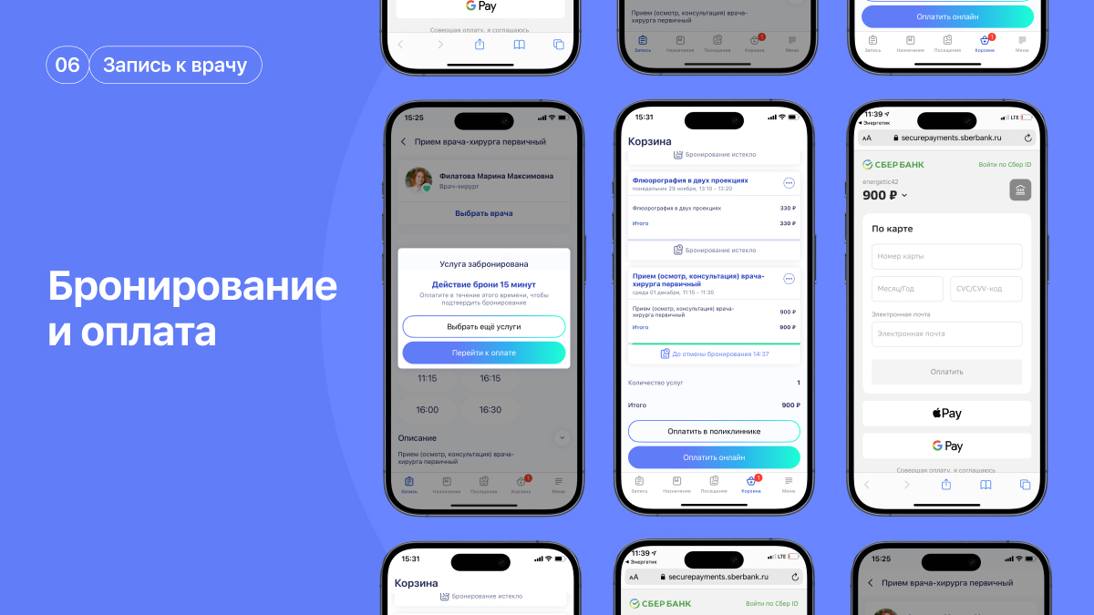 Чтобы закрепить за собой запись, нужно перейти в корзину выбрать способ оплаты: онлайн или в поликлинике — приложение не обязывает оплачивать услугу заранее. Если пациент выбирает онлайн-оплату, то услуга оплачивается в приложении с помощью карты, Apple Pay, Google Pay.