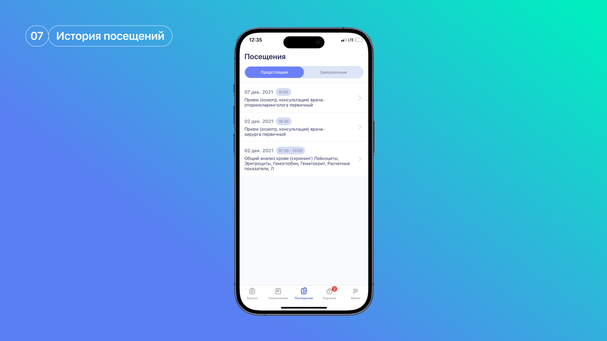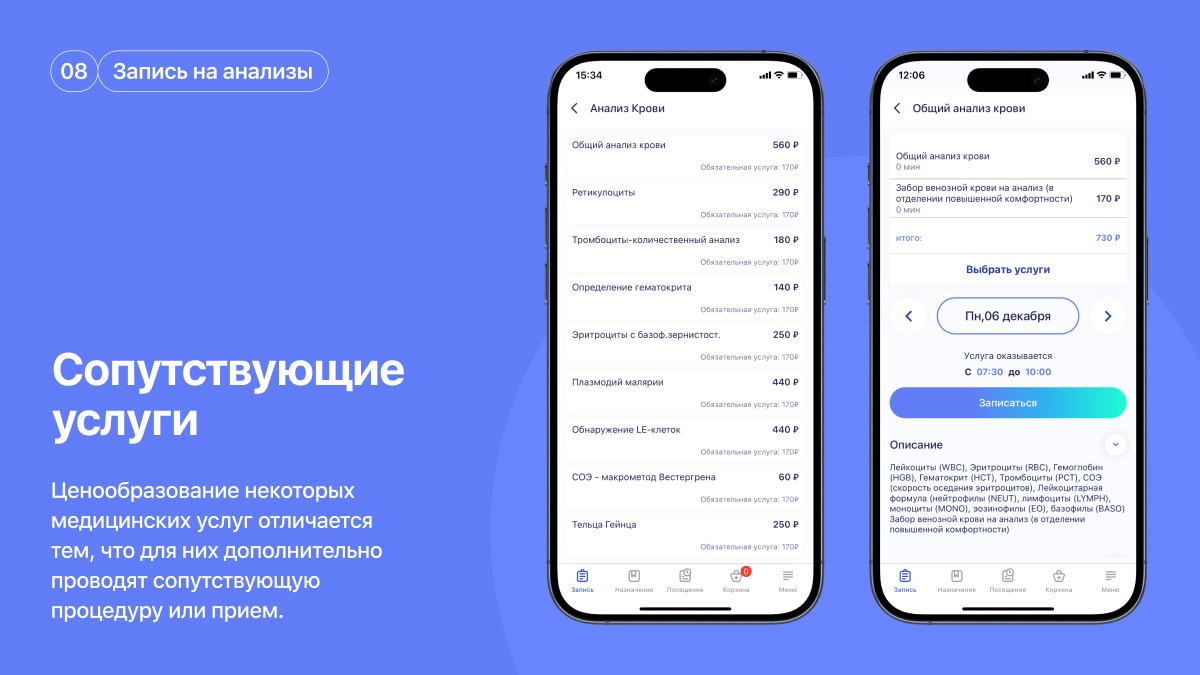 Еще одна особенность — рекомендации перед посещением. Кровь сдают натощак, перед мазком на COVID-19 врачи рекомендуют не пить, а к сложным исследованиям вроде гастроскопии нужно готовиться заранее и соблюдать ограничения после. Эта информация выводится для подготовки пациента.