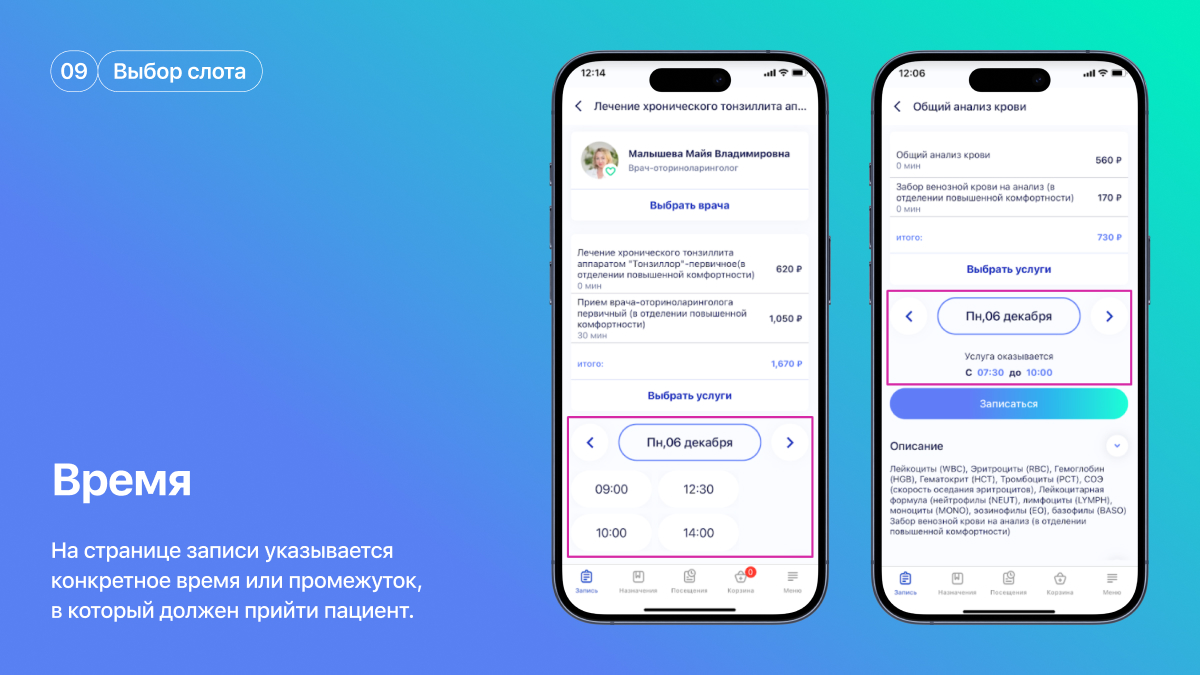 Ряд услуг предоставляются не в определенное время, а в промежуток. Все тот же забор венозной крови проходит с утра, при этом можно прийти на процедуру в указанный диапазон времени. Этот нюанс тоже учтен — в зависимости от типа процедуры на странице записи указывается конкретное время или промежуток, в который должен прийти пациент.