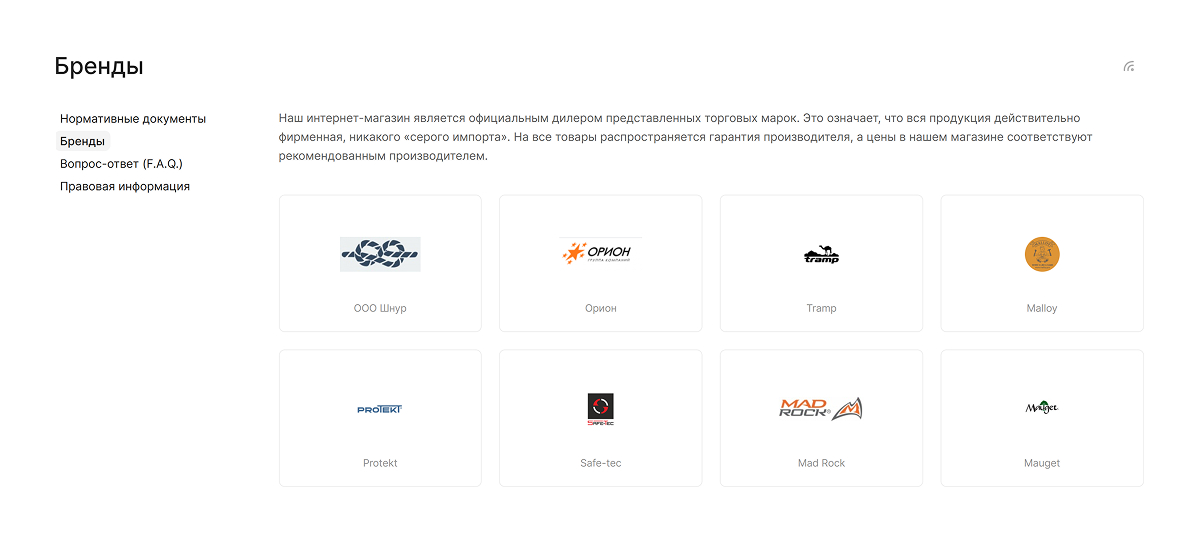 В разделе собраны нормативные документы, FAQ и список брендов. Это повышает доверие покупателей к магазину.