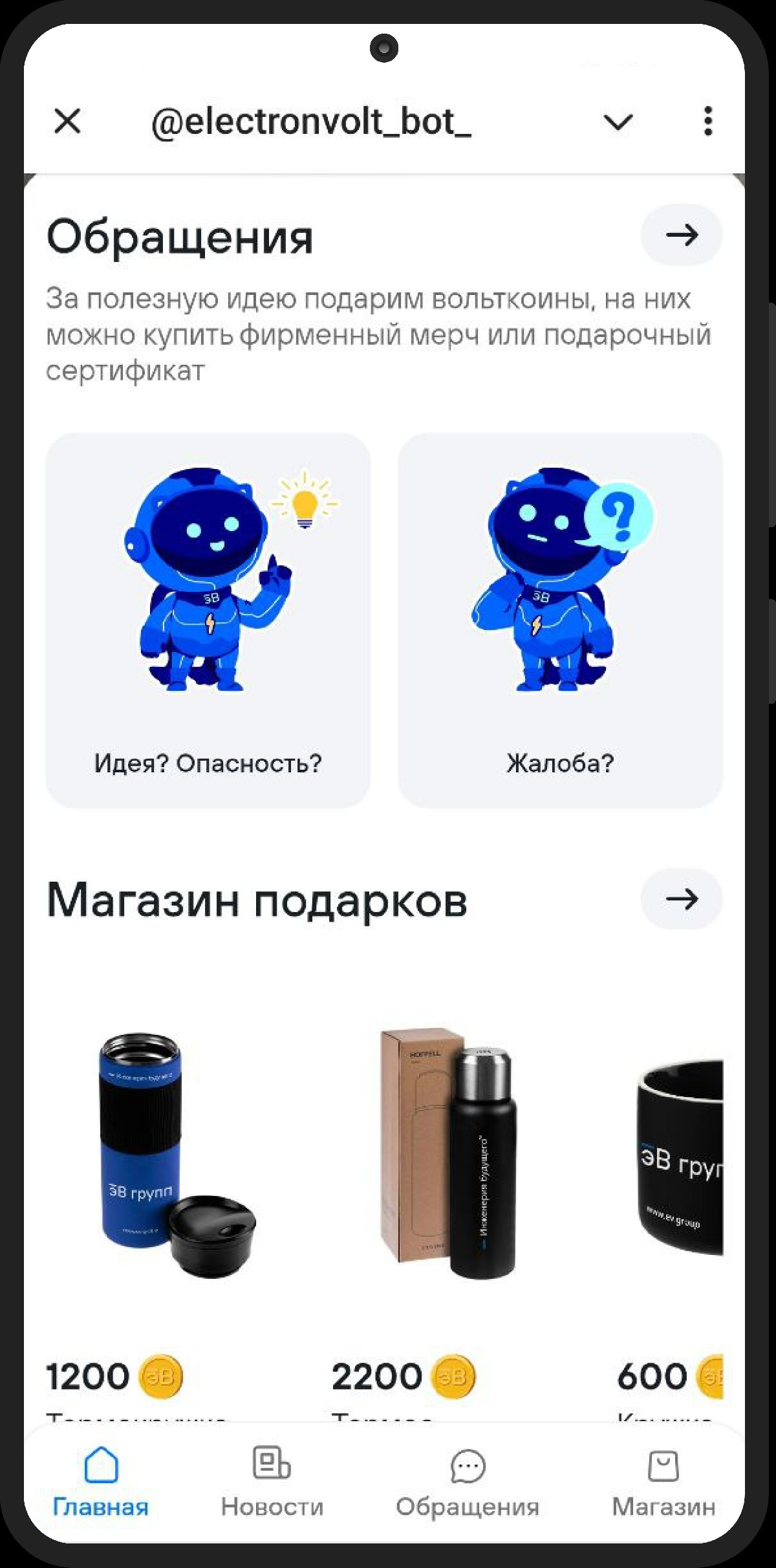 Решение — Telegram-бот с MiniApp. Все сервисы компании собраны в одном месте. Авторизация, обучение, новости, подача жалоб и предложений, база знаний с ИИ, а также магазин подарков всего в паре кликов.