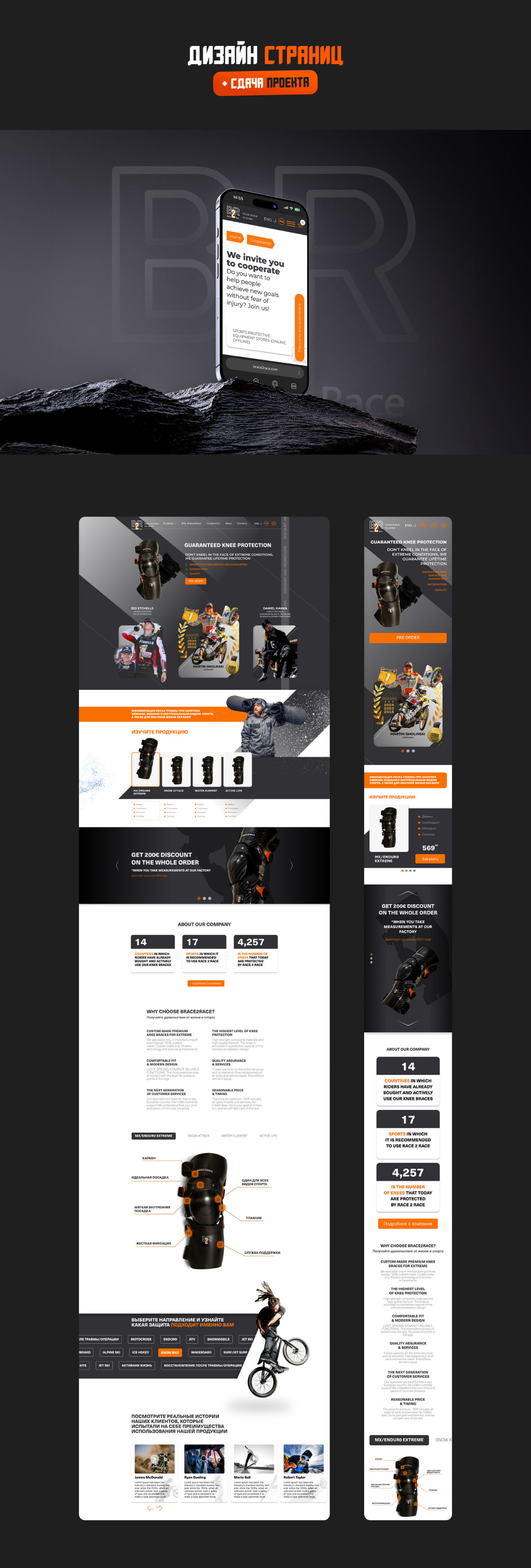 Компания Brace to Race изготавливает наколенники для профессиональных спортсменов, используя 3D-сканирование и полимеризацию углеродных деталей. Для выхода на европейский рынок разработан сайт с акцентом на мобильную версию, адаптивность и уникальный пользовательский интерфейс.