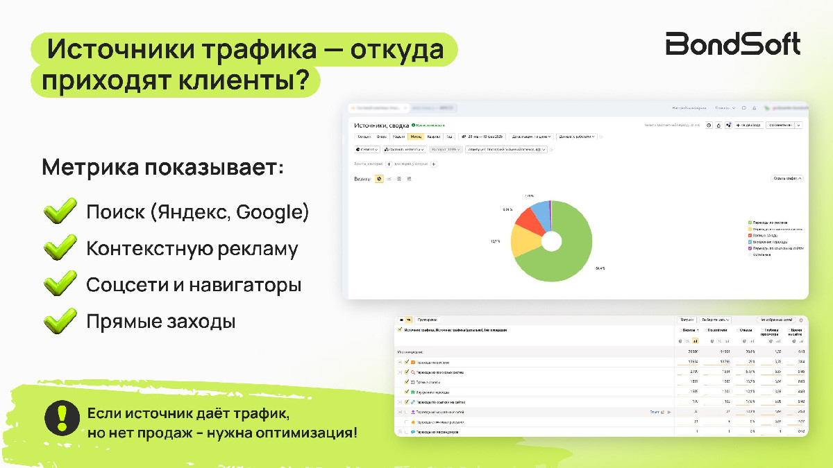 - Через отчёт «Источники, сводка» стало видно, какие каналы реально работают;
