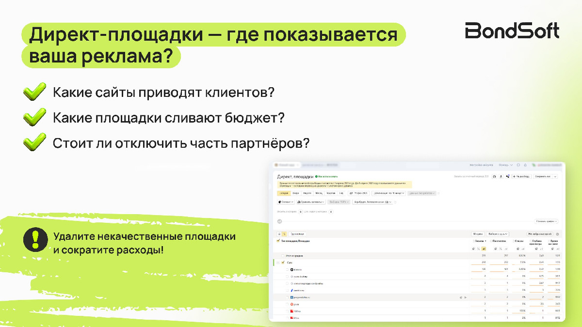 - Реклама в РСЯ шла по тысячам сайтов, часть из которых — откровенно бесполезные;