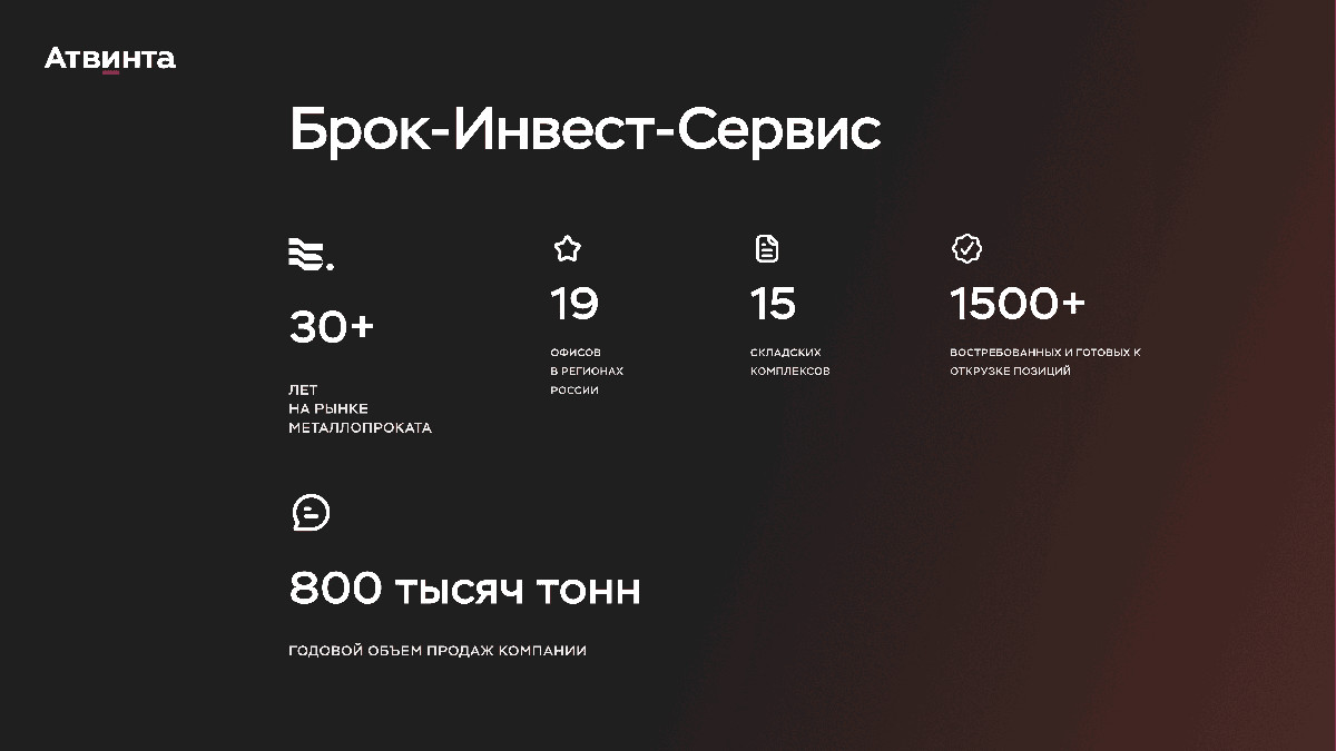 «Брок-Инвест-Сервис» — лидер российского рынка металлопроката и металлообработки, входит в топ-10 металлотрейдеров России. Компания поставляет материалы для строительства, проведения коммуникаций в жилых и коммерческих зданиях, а также для создания федеральных и транспортных объектов: станции метро в Москве, аэропорт Шереметьево, Керченский мост и другие.