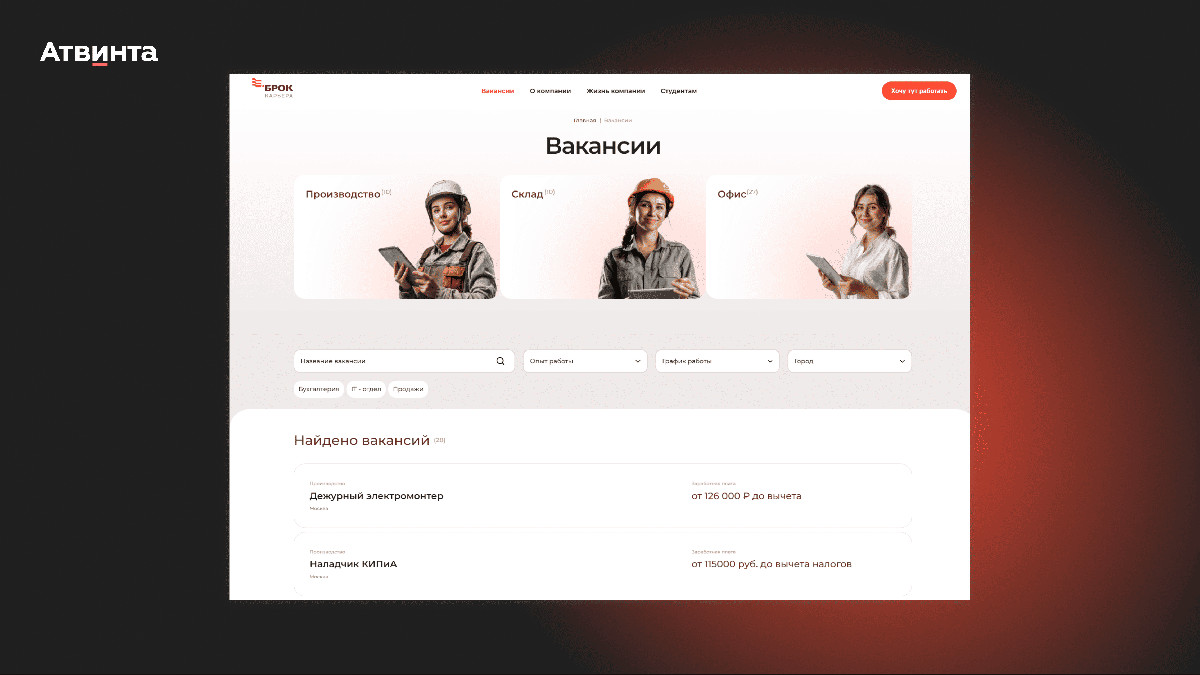 Для «Брок-Инвест-Сервис» мы разработали привлекательный и динамичный сайт, на котором кандидаты видят ценности компании, а также легко находят интересующие их вакансии.