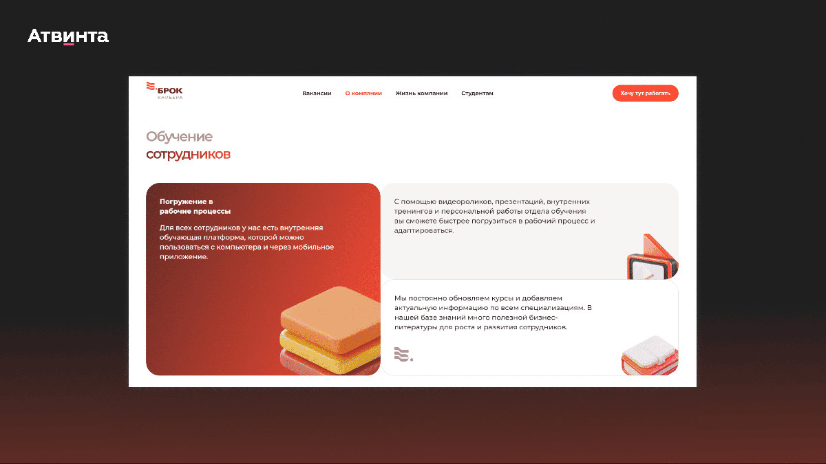 Затем добавили факты в цифрах, миссию, форму обратной связи и этапы онбординга для сотрудников. Чтобы кандидаты могли быстро адаптироваться, «Брок-Инвест-Сервис» разработал внутреннюю систему обучения и информирования персонала. Платформа позволяет учиться через десктоп или мобильное приложение.