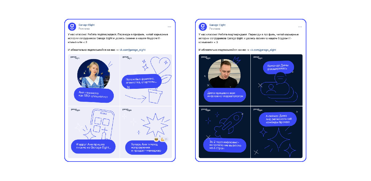 - В Телеграме и LinkedIn больше показываем экспертность: говорим про развитие, рассказываем про инструменты, подходы и решение задач — всё на волне Garage Eight и от лица команды.