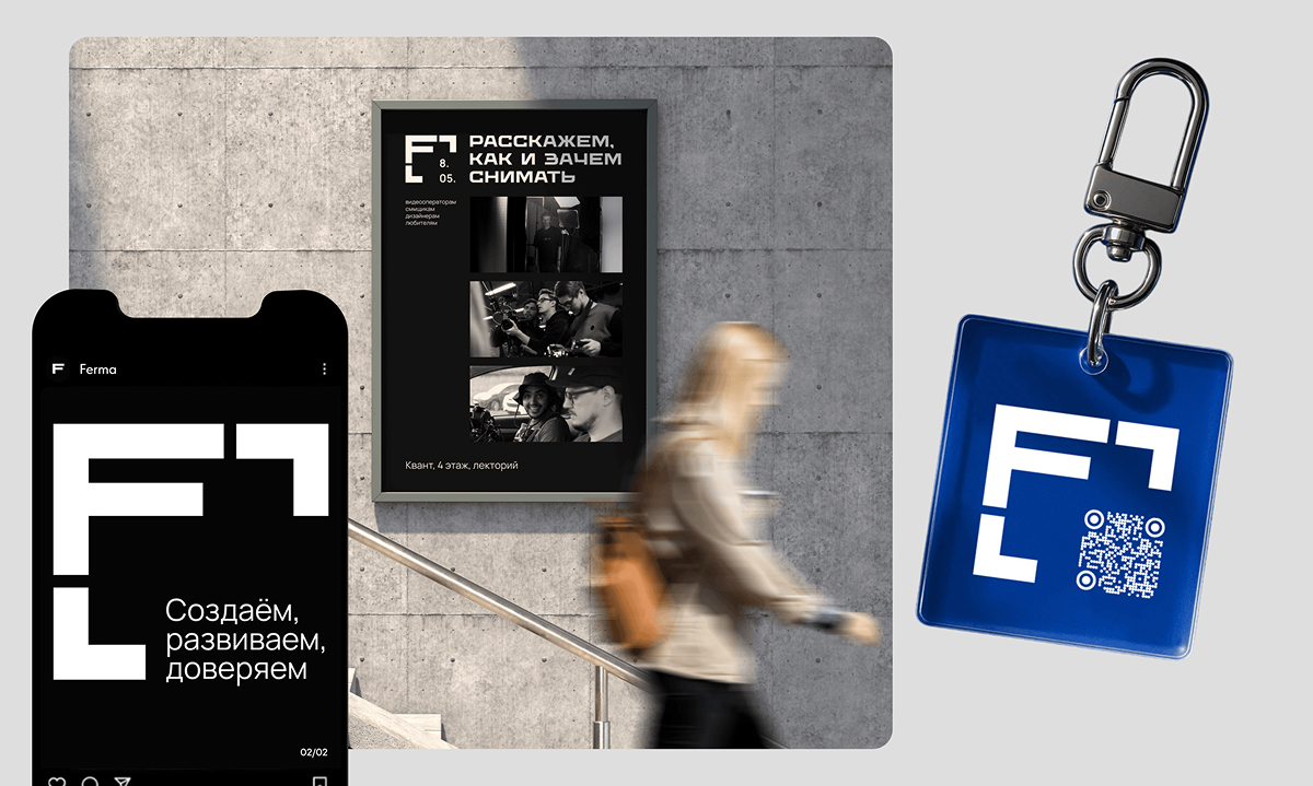 Вместе с логотипом мы разработали фирменный знак — отличительный элемент брендинга. Он собран из буквы F и рамок, расставленных по углам квадрата. Такая композиция напоминает рамку видоискателя: символический намёк на деятельность компании.