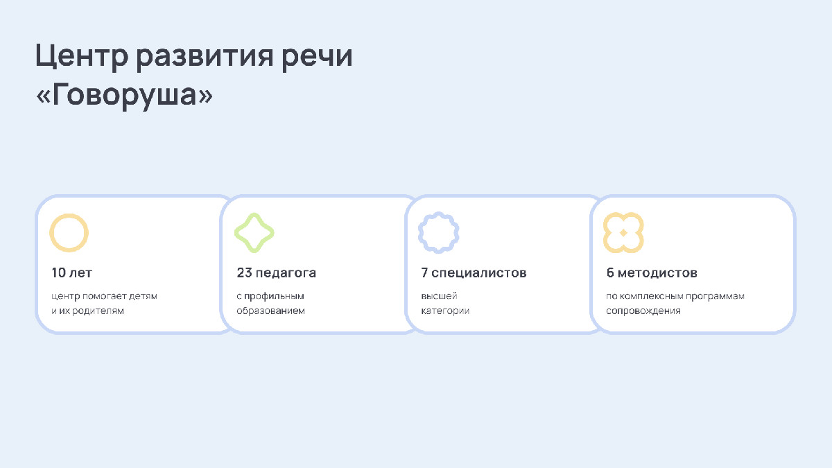 Раздел «О центре» знакомит с достижениями и ключевыми преимуществами «Говоруши». Здесь собрана информация о подходе к коррекции речевых, поведенческих и интеллектуальных нарушений, команде специалистов и научной деятельности. Этот раздел помогает родителям лучше понять, почему «Говоруша» — надежный выбор для развития их ребенка.