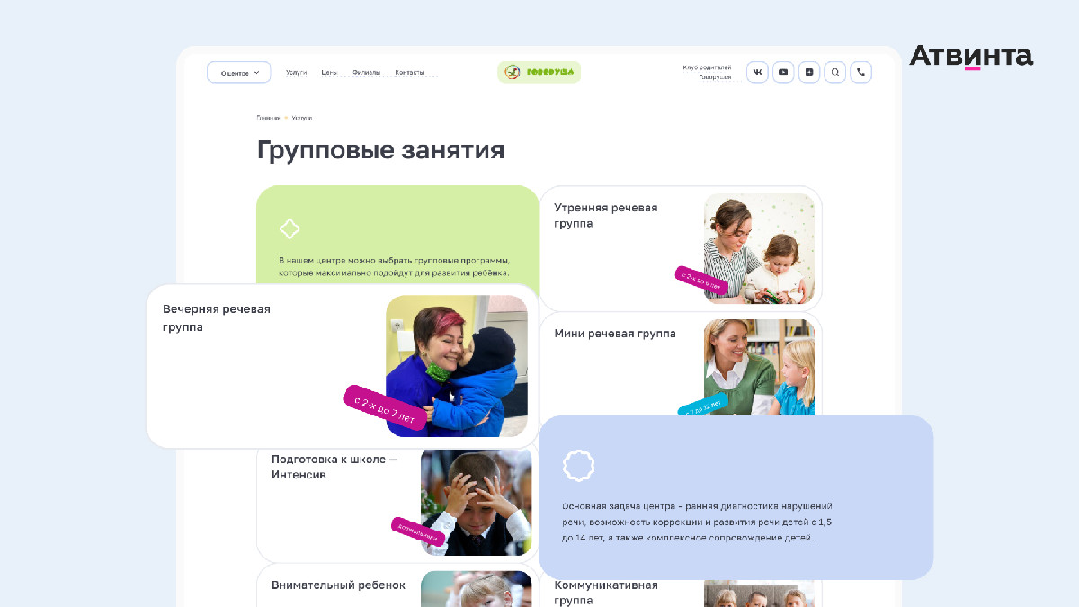 Редизайн сайта "Говоруши" заменил устаревший портал на стильный, удобный и информативный ресурс с улучшенным пользовательским опытом, детальной информацией об услугах, ценами, отзывами и блогом, что усилило доверие, увеличило трафик и ускорило обратную связь с родителями.
