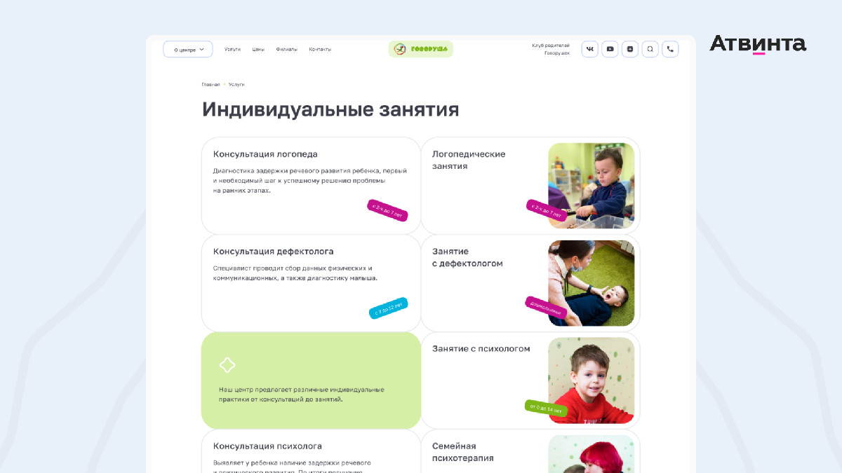 Специфика продуктовой линейки центра — широкий выбор программ, направленных на развитие и коррекцию речи, поведения и моторики у детей. Услуги различаются по формату и методикам. Родителям бывает сложно сразу определить, что подойдет их ребенку, ведь каждый случай индивидуален. Мы сделали удобный раздел с услугами, чтобы пользователи могли легко ориентироваться в них.