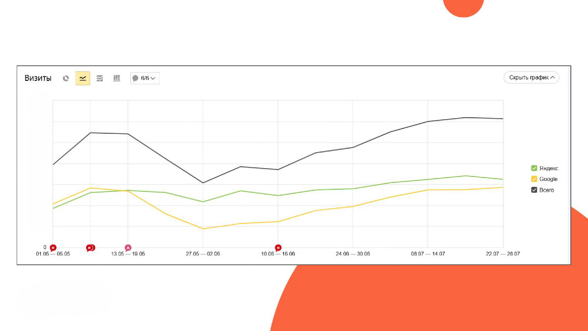 К концу июня мы преодолели просадку, и сайт вернулся к показателям до переезда. С июля начинается рост.