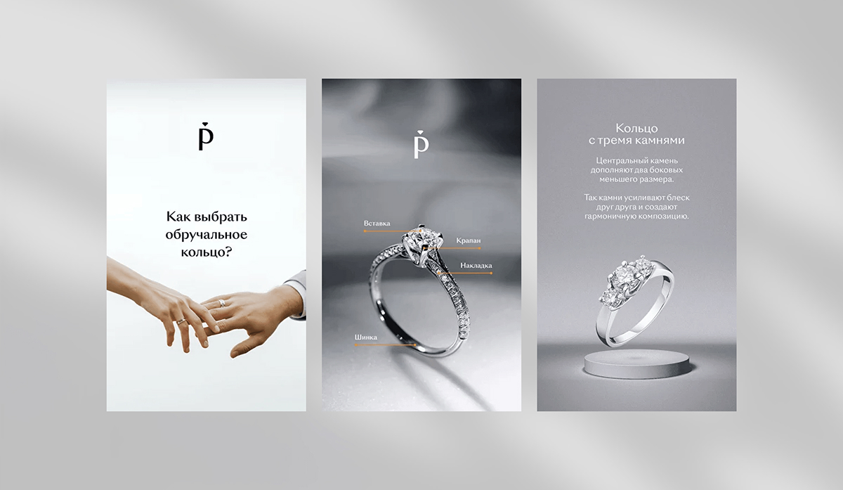 - Свадебный контент — посты и сторис c советами по подбору помолвочных и обручальных колец и отражением свадебного ассортимента.