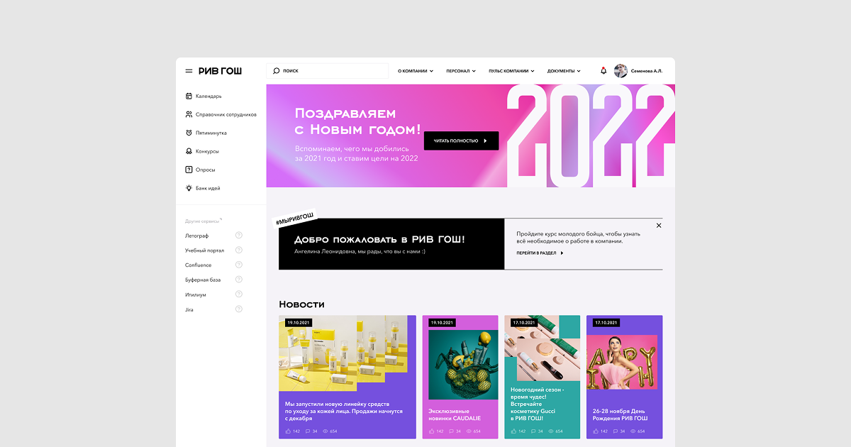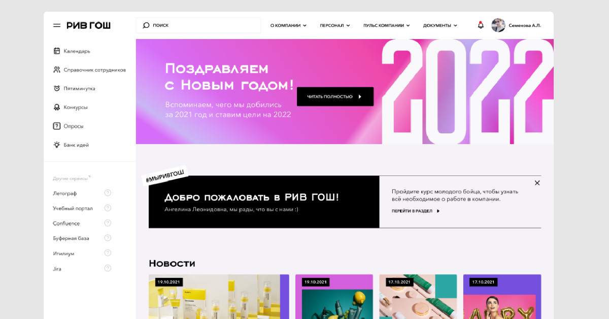 Всё начинается с главной страницы — связующего элемента для всего корпоративного портала «РИВ ГОШ»