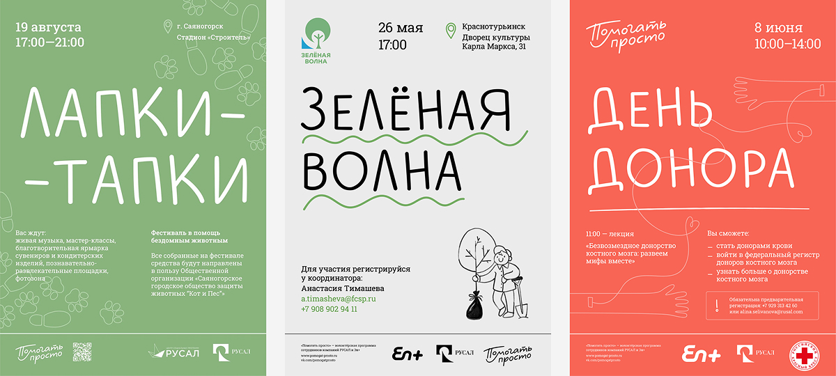 В рамках волонтёрской программы «Помогать просто» периодически проводятся акции и мероприятия. У каждой из них своя идея, у некоторых даже отдельные фирменные стили. Мы решили визуально объединить эти программы под эгидой «Помогать просто», но чтобы не возникало путаницы и итоговые материалы были едины во всех регионах, нами были разработаны правила и прописаны гайды по оформлению мероприятий фонда.