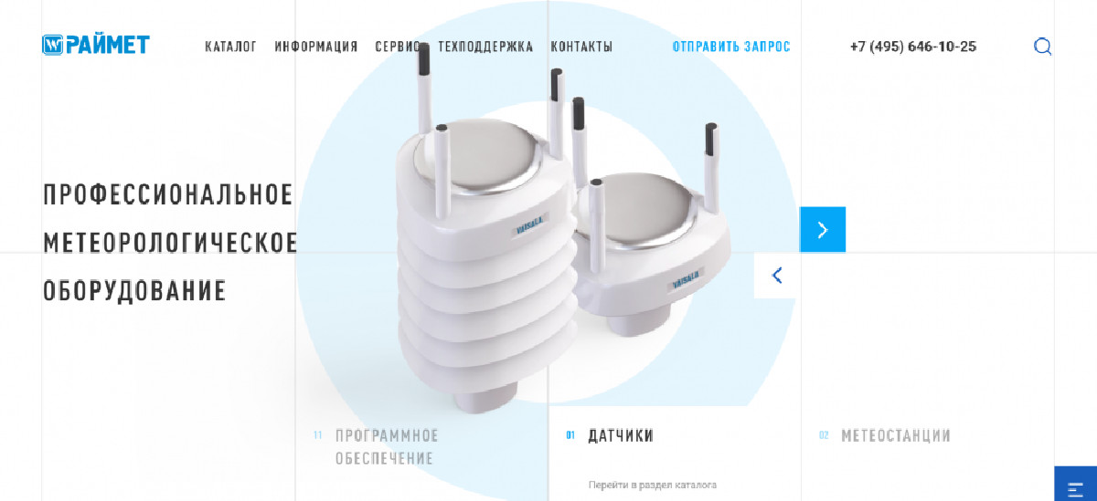 Основной акцент сделан на анимированные 3D-модели метеорологического оборудования. Этим сайт визуально удивляет и вовлекает пользователя — хочется пролистать все слайды и посмотреть каждую из 11 сборок.