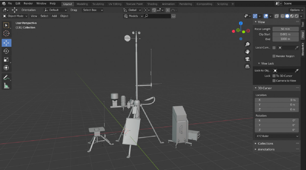 Оборудование моделировали с нуля. Для этого запросили у клиента фотографии самых ходовых позиций по каждой категории с разных ракурсов. Также для проработки глубокой детализации мы нашли реальные чертежи метеорологического оборудования в интернете. Эти материалы стали основой для моделирования.