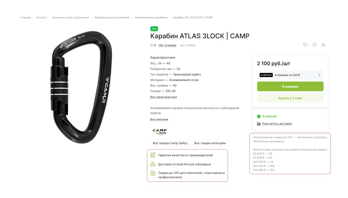 6. Работа с посадочными страницами и карточками товаров. Мы добавили на сайт облако тегов. Это помогло привлечь дополнительный трафик по более узким запросам. В карточках товаров появились блоки с преимуществами, подсказки о скидках, а также табы с информацией о доставке и оплате.
