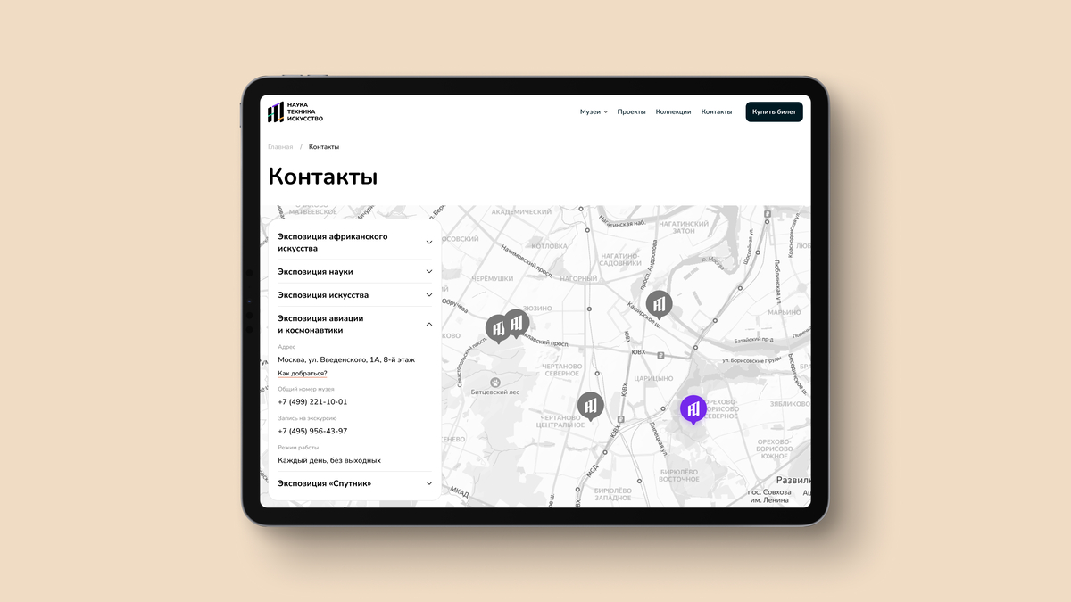 Главная страница помогает быстро найти нужную информацию. Все разделы чётко структурированы — это позволяет посетителям легче искать нужную информацию. На главной странице также реализованы важные функции, такие как онлайн-запись на экскурсии, покупка билетов и просмотр детализированных страниц экспонатов. Адаптивный дизайн сайта обеспечивает комфортный просмотр на любых устройствах.