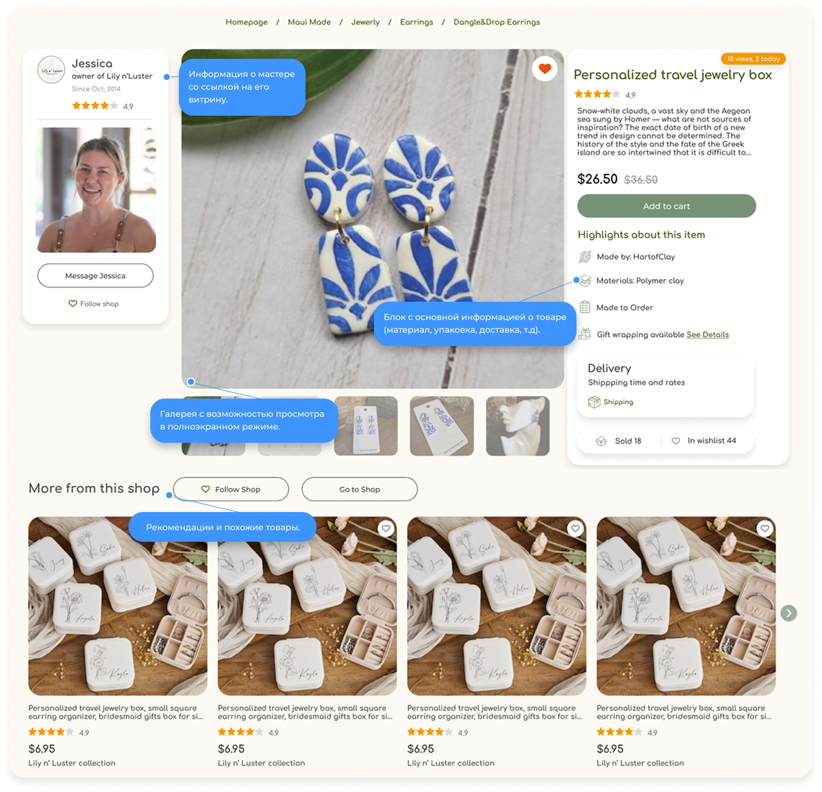 - Блок с подробным описанием от мастера, историей создания, отзывами;