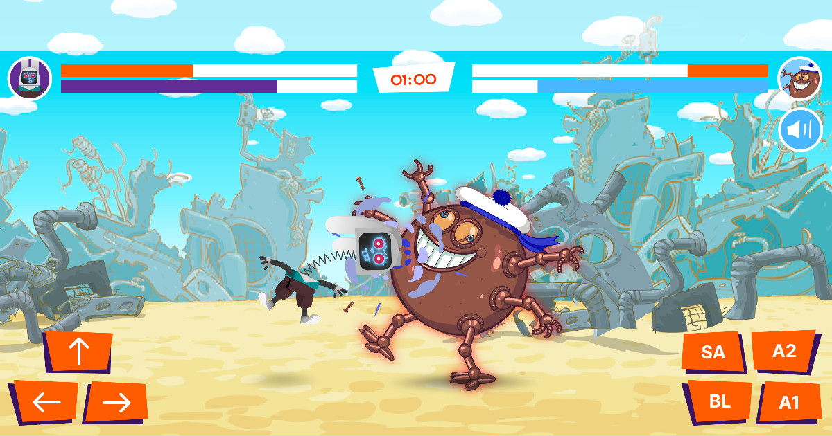 Тестирование проводилось силами внутренней команды и фокус-группы. Мы проверяли не только техническую составляющую, но и геймдизайн. На фокус-группе из детей мы протестировали наши теории об управлении кнопками и горизонтальном формате. Оба кейса прошли успешно – трудностей и непонимания во время игры у детей не возникло. Отдельное внимание мы уделили настройке баланса. Отзывы тестеров помогли нам окончательно откалибровать силу ударов, скорость персонажей и логику работы бота.