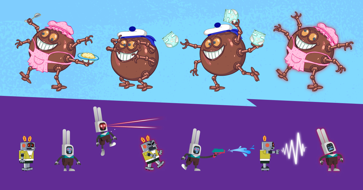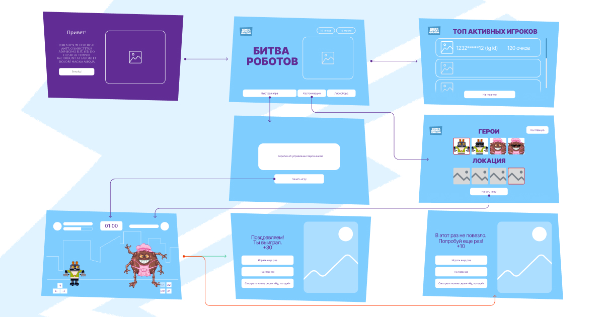 Суть проекта заключалась в разработке игры-файтинга между робо-версиями персонажей: Робо-Заяц (от «Ну, погоди!») и Железная Няня (от «Смешариков») в формате Телеграм Mini App. Бои между персонажами – это не самая популярная для маркетинга механика, так как считается агрессивной, требует терпения, тренировок и времени на освоение комбинаций. Однако, клиенты загорелись идеей выйти за рамки привычного.
