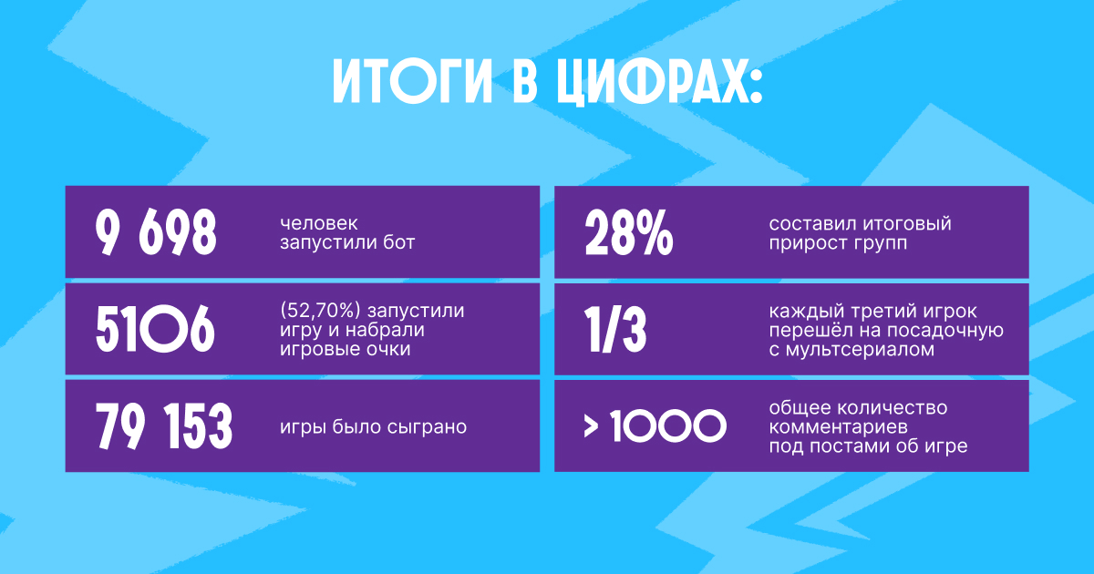 Для клиента эта геймификация стала одной из самых успешных. Без медийной поддержки, с помощью перекрёстного обмена аудиторией, были получены следующие результаты, которые лягут в основу следующих проектов: 9698 человек запустили бот, из них 5106 (52,70%) запустили игру и набрали игровые очки. Всего было сыграно 79 153 игры в среднем по 8 игр на пользователя. Итоговый прирост групп составил 28%. Каждый третий игрок перешёл на посадочную с мультсериалом. А общее количество комментариев под постами об игре перевалило за 1000.