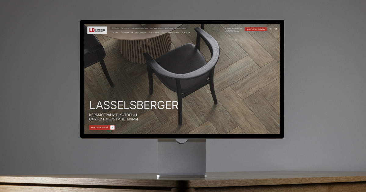 Мягкий редизайн LB Ceramics: обновили сайт и визуальную систему без потери узнаваемости. Сделали главную, лендинги под форматы, электронный каталог и офлайн-айдентику. Посещаемость лендинга 45×45 выросла втрое после запуска рекламы на фоне обновления.