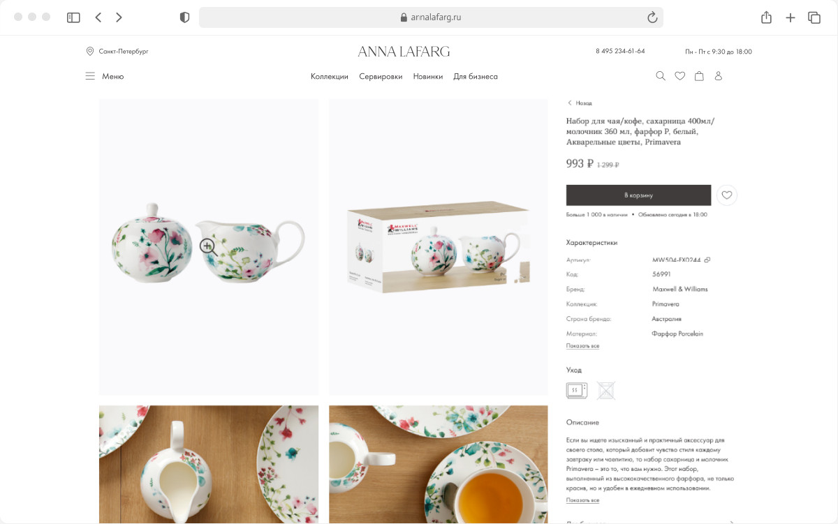 Каждую коллекцию или сервировку можно добавить в избранное, как готовую подборку товаров. Каталоги и тематические подборки контент-менеджеры создают в «Битрикс». «Коллекции» и «Сервировки» собираются как промо-разделы.