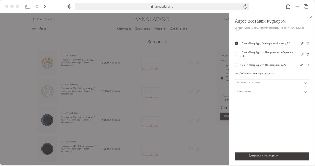 Параллельно с разработкой нового сайта команда Anna Lafarg решила полностью перестроить внутренний учет — старая учетная система была заменена на 1С. Это означало, что интеграцию мы проводили с постоянно меняющимся сервисом. Дополнительным вызовом стало обновление большинства фото-контента. В итоге на каждом этапе мы точечно настраивали и адаптировали процесс синхронизации.