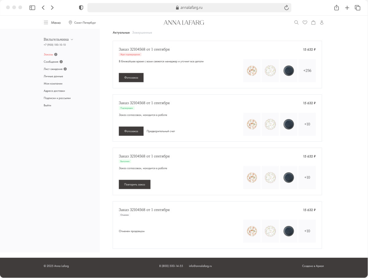 - История заказов. Все прежние заказы распределились по личным кабинетам на основе e-mail. Там, где артикулы товаров совпадают с новой базой, позиция кликабельна. Если продукт снят, выводится превью без ссылки.