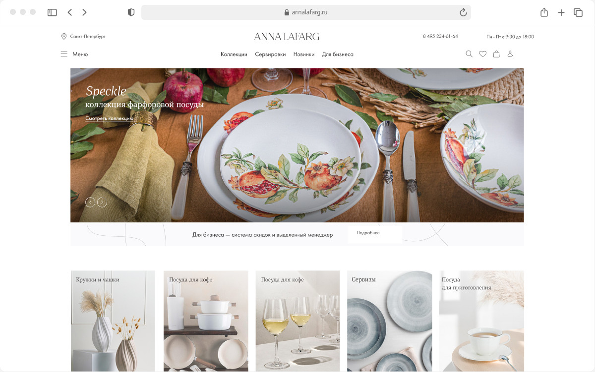Бренд Anna Lafarg работает на территории России и стран СНГ с 1998 года. За это время компания выросла в одного из крупнейших оптовых продавцов посуды, подарков и предметов интерьера. Ассортимент включает как функциональные предметы для сервировки и кухни, так и интерьерные аксессуары. Клиенты бренда — оптовые покупатели, розничные сети и частные ценители красивого дома.