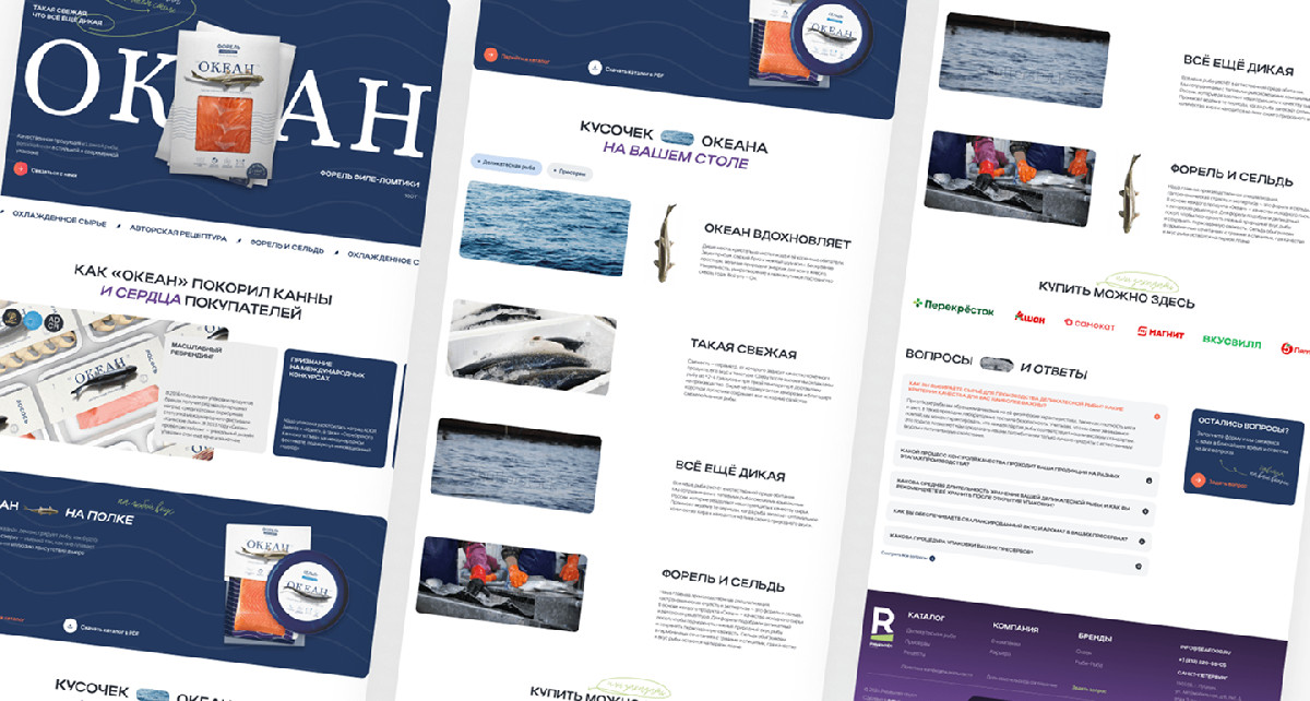У заказчика три бренда — «Океан», «Рыба-Рыба» и «Кетус». Для каждого мы сделали собственную страницу-лендинг: структура похожая, но визуал и настроение разные.