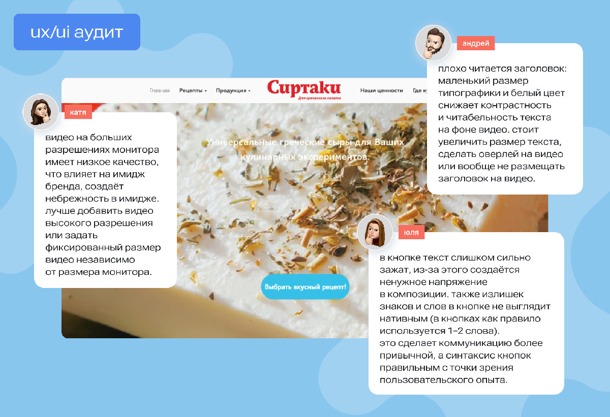 Чтобы добиться максимальных результатов, мы задействовали всю команду. изучали поведение пользователей на старом сайте, анализировали исследования заказчика по потребителям. много времени уделяли ключевым запросам, по которым можем привести людей. во время обновления сайта мы исходили в первую очередь от маркетинговых задач. поэтому помимо разработки визуальной концепции сайта и проектирования удобной структуры проработали и контент с рецептами — так, чтобы он отвечал запросам пользователей и вызывал желание как можно больше взаимодействовать с брендом. отдельно хочу отметить комфортную работу с заказчиком: он не только полностью доверился нашей экспертизе, но и помог лучше узнать целевого потребителя сыра.