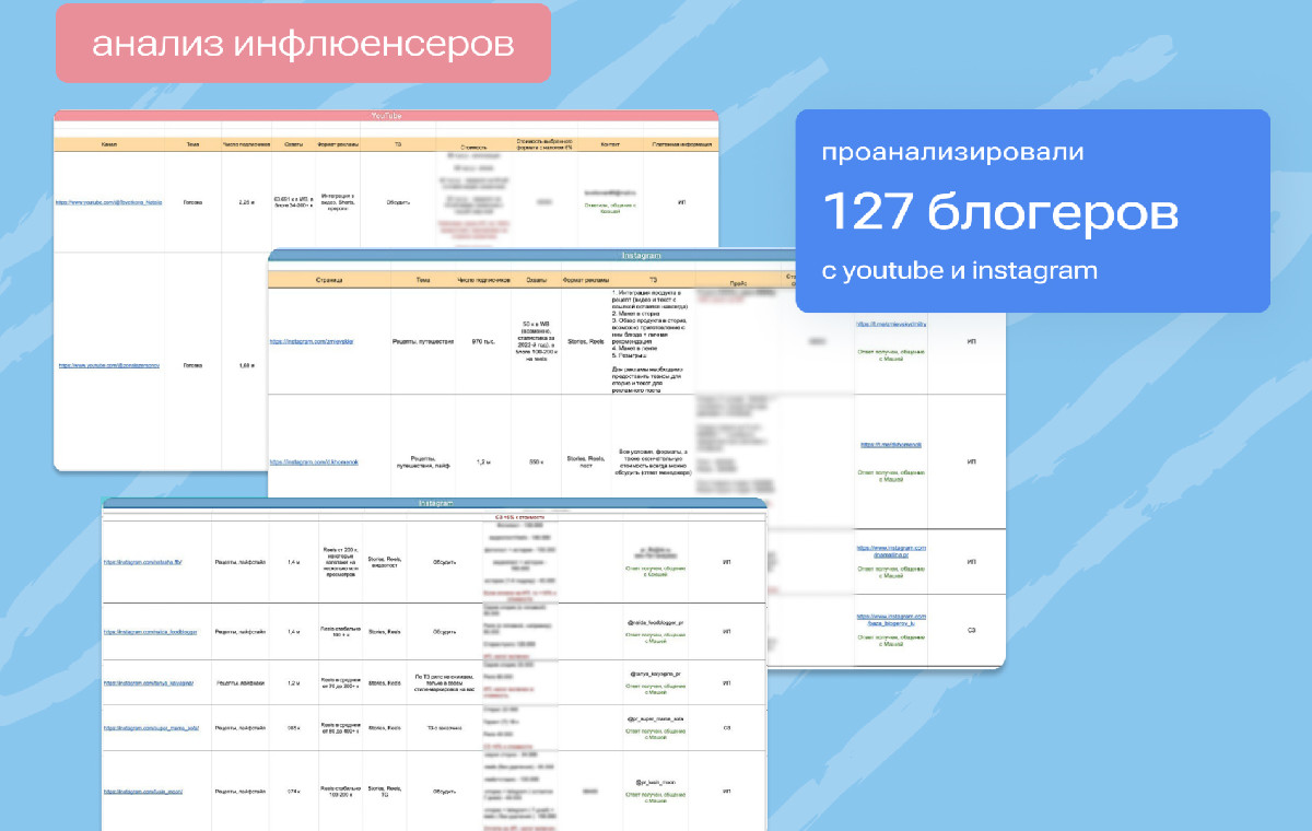 Дальше — ручная работа. Связались с каждым блогером, уточнили реальные охваты и стоимость размещения, потому что цифры в открытом доступе часто далеки от правды. Получив свежие данные, сузили список и согласовали финальный пул с заказчиком.
