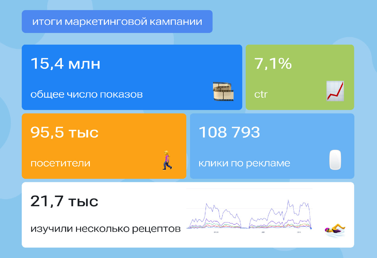 Команда предложила крутые идеи — добавили фильтры на сайт, сделали удобную навигацию. Пользователи быстрее находят рецепты и глубина просмотра увеличилась. Реклама тоже сработала: были переходы и вовлечённость. Конечно, нельзя всё отследить до покупок, но по охватам рекламная кампания была эффективна.