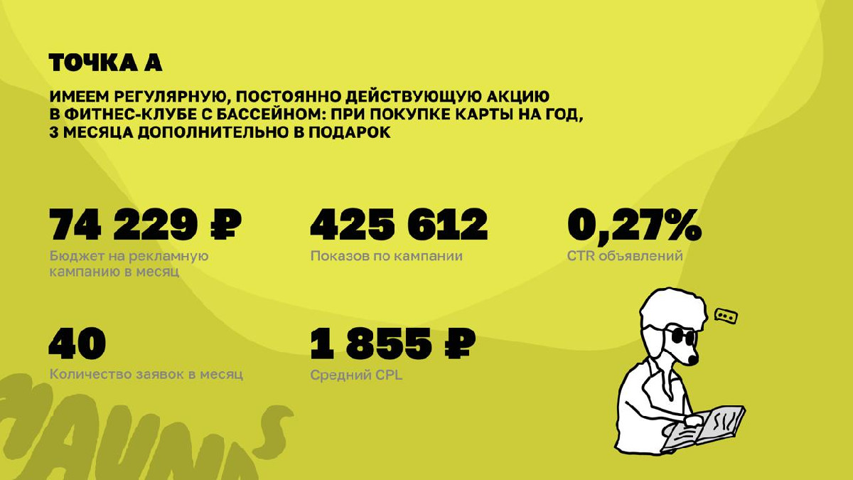 Точка А. Цена лида превышает стандартную для этого клуба примерно в два раза, а значит, надо либо доработать эту кампанию, либо сносить. Убирать ее жалко — все-таки хорошая рабочая лошадка на протяжении долгого времени. Остается второй вариант.