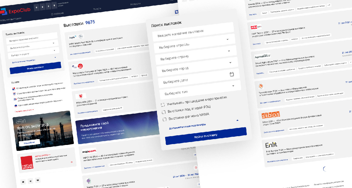 Проработали целевую аудиторию — от организаторов выставок и участников до госструктур — и учли сценарии использования для каждой из групп. Конкурентный анализ показал, что большинство отраслевых порталов имеют устаревший дизайн и слабую адаптацию под мобильные устройства. Это определило вектор на современную визуальную подачу и лёгкий UX.