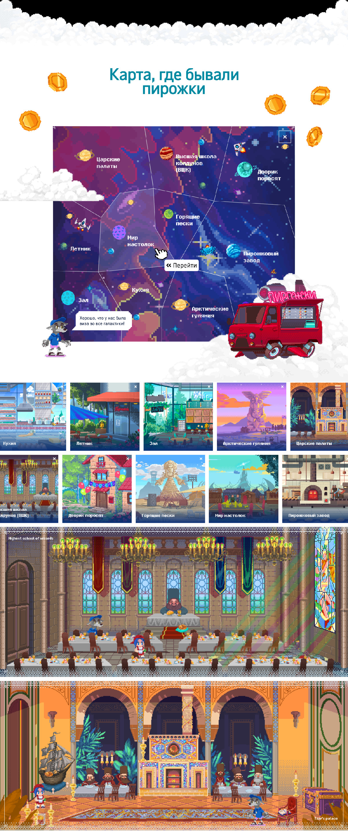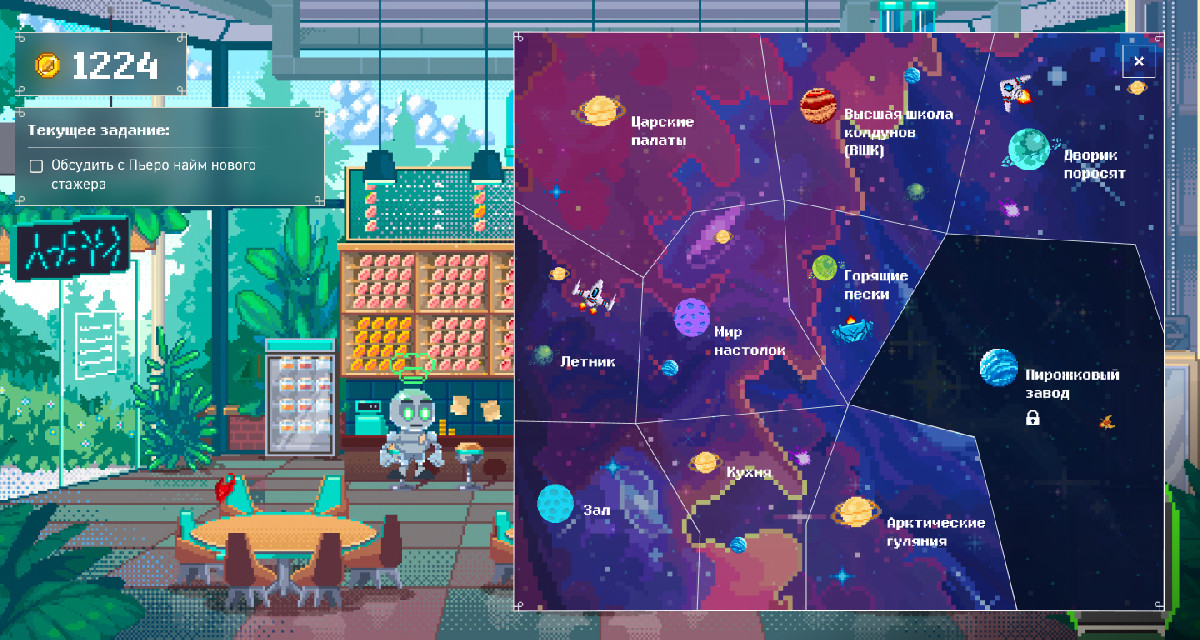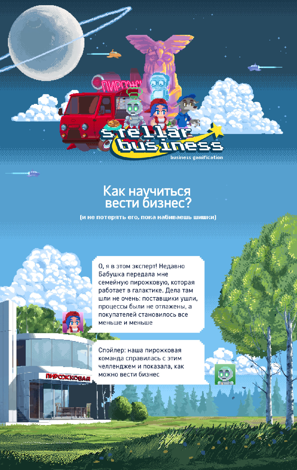 Бизнес-симуляция для Газпром нефти: сюжет — пирожковая в космосе на основе сказки, 5 глав, 12 локаций, пиксель-арт, 36 заданий, 97% завершения курса, геймификация, обучение управлению и мотивации команды. Проект — 100+ часов работы, сценарий — 115 страниц.