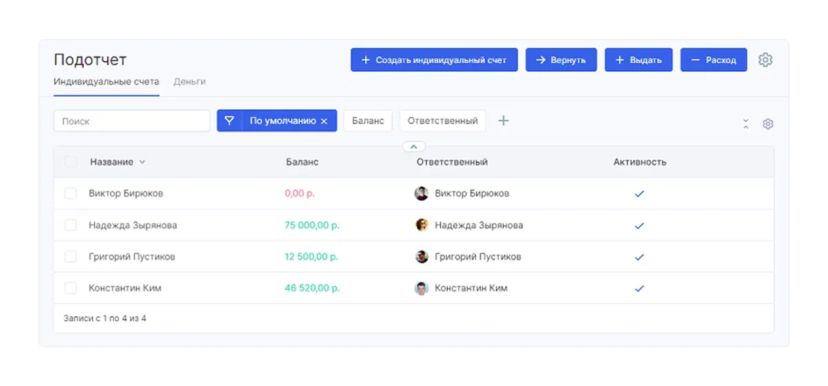 Используется модуль «Подотчет» в Аспро.Финансы.