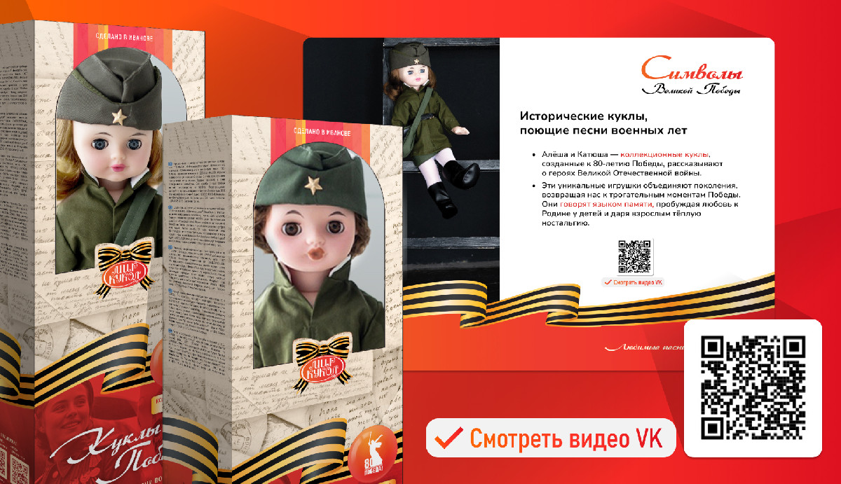 Две куклы, мальчик Алёша и девочка Катюша, которые созданы в стиле советских кукол, одеты в военную форму времен ВОВ и имеют звуковое сопровождение — песни военных времен — «Катюша», «Землянка», «Синий платочек», «Алёша», «Смуглянка», «Родина». Разработаны к 80‑летию Великой Победы.