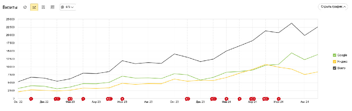 Аналитика велась непрерывно: отслеживались позиции, индексируемость, видимость, корректность сниппетов. Это позволило вовремя реагировать на изменения алгоритмов поисковых систем и сохранять стабильную положительную динамику.
