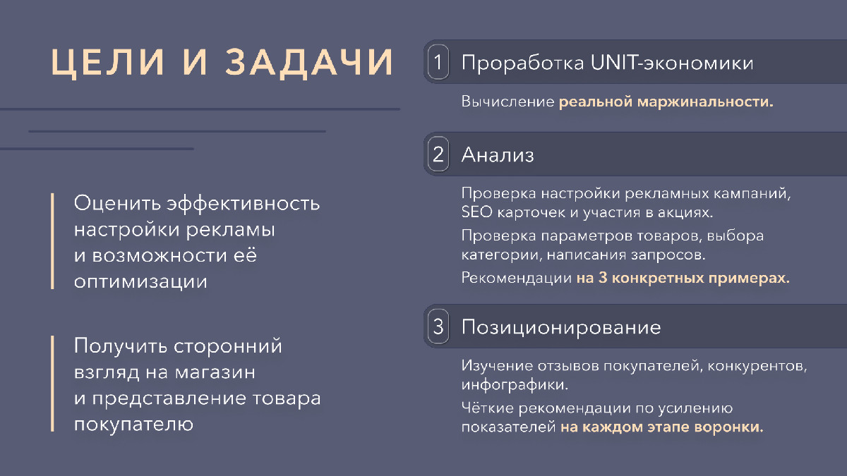 Мы предложили проанализировать магазин по 3 главным направлениям: ценообразование, внутреннее продвижение и представление товаров на примере 3-х карточек, чтобы выявить точки роста. Именно эти факторы в основном влияют на прирост оборотов.