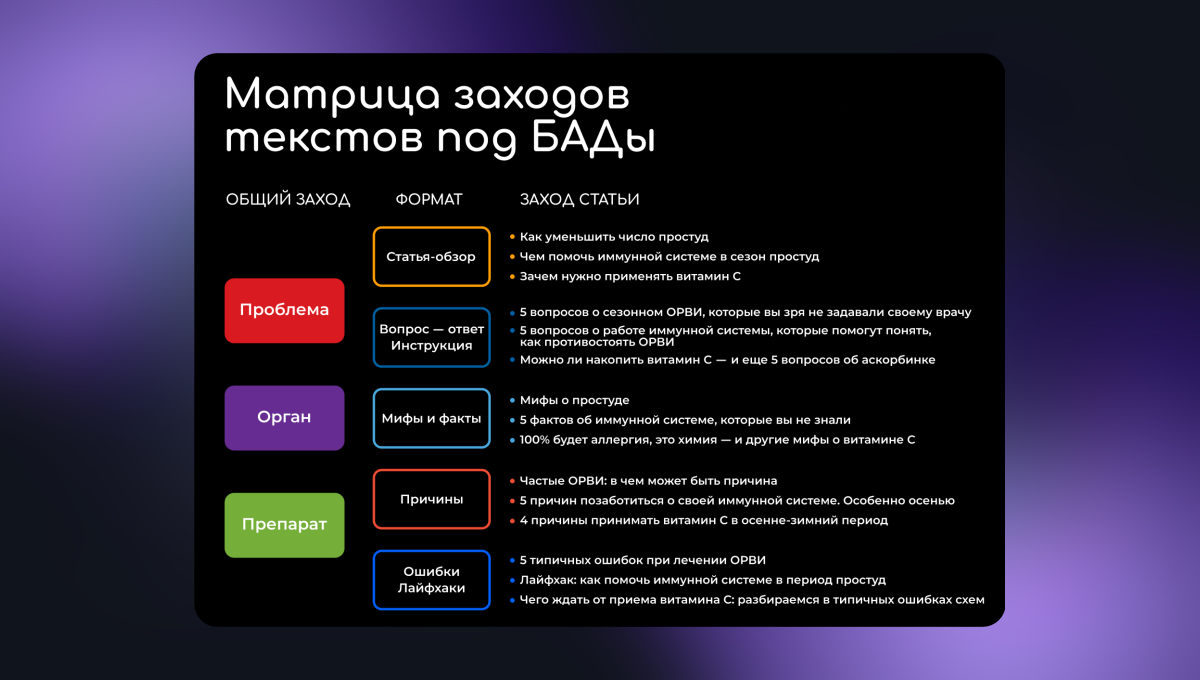 Разнообразие достигалось через матрицу заходов — комбинацию подходов к продукту и форматов изложения. Например, для витамина С мы написали две статьи. Первая отталкивалась от самого препарата и играла на теме, что все врачи говорят про витамин D3, а про витамин С молчат, хотя дефициты С не менее распространены. Вторая шла от проблемы и рассказывала о связи витамина С и частых ОРВИ у детей, которые начали посещать детский сад.