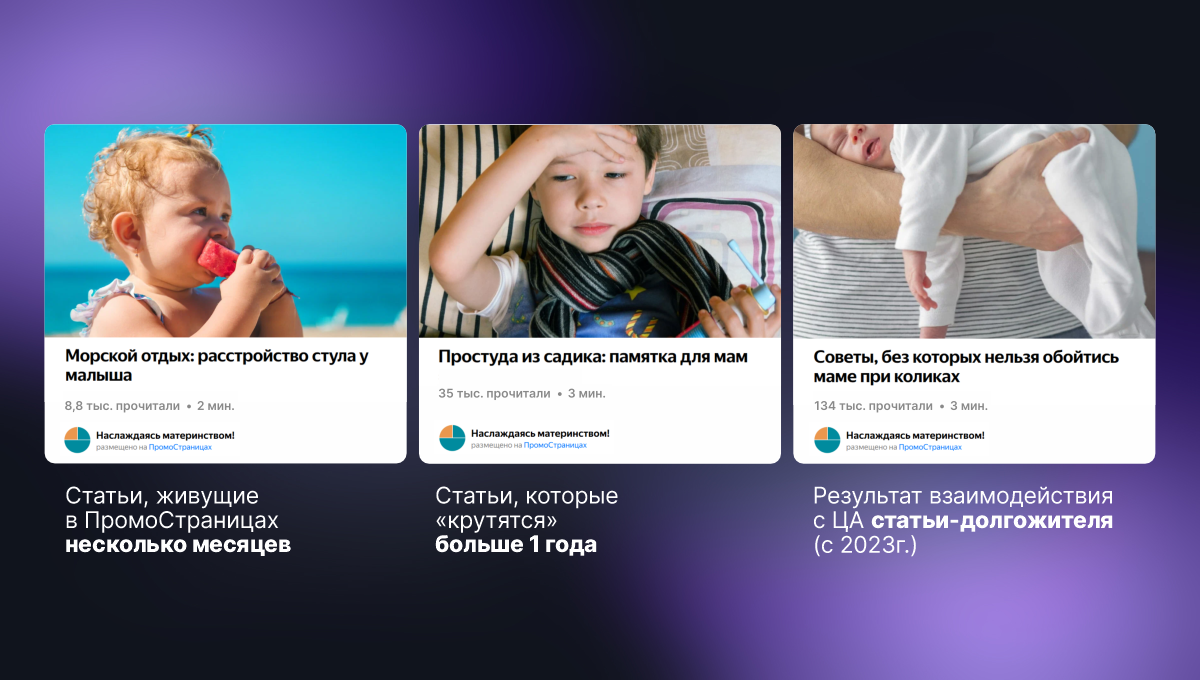 По итогам первого месяца стало ясно, что первый вариант не зашёл. А вот извечная проблема «сад — ОРВИ — больничный» крутилась уверенно и набирала обороты. Первый креатив отключили, второй продолжил работать, и за 12 месяцев его дочитало почти 111 тысяч человек. Среднее время прочтения составило более 3 минут — это значит, что люди не просто пролистывали, а вникали в материал, знакомились с продуктом и брендом.